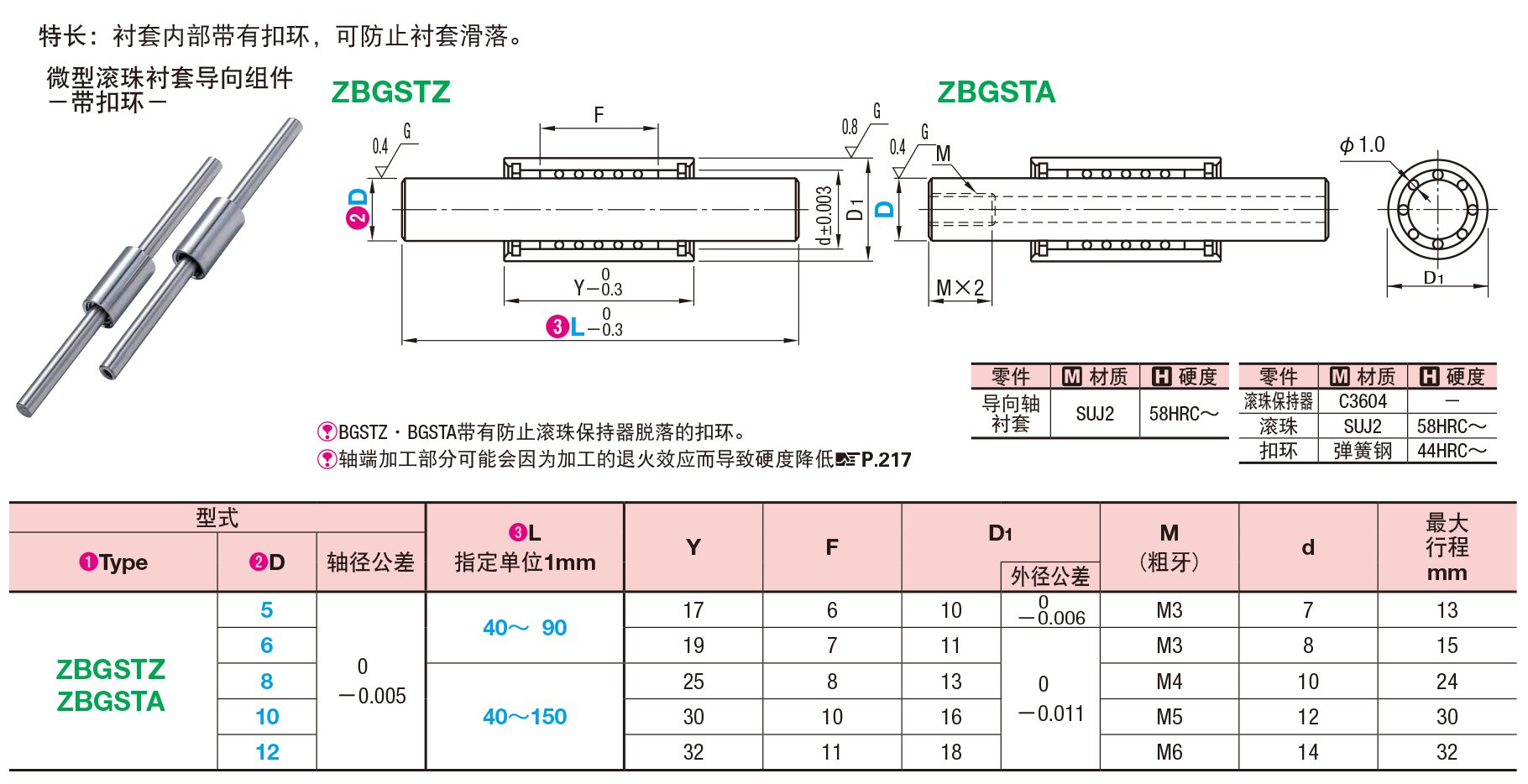 微型滚珠衬套导向组件带扣环型结构可有效防止保持器脱落,提高组件在高频动作或振动工况下的可靠性。