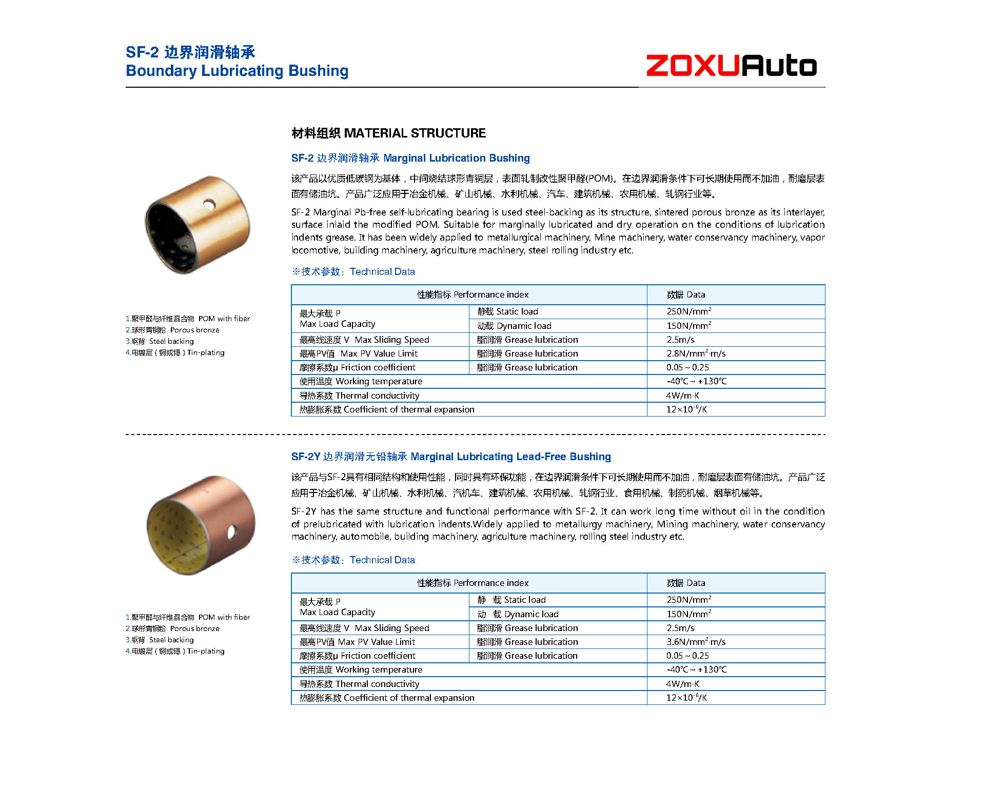 SF-2边界润滑轴承,又称复合层型无油衬套,采用优质低碳钢基体,中间烧结球形青铜层,表面轧制改性聚甲醛(POM)耐磨层结构设计。该产品适用于边界润滑或少油工况,可实现长期稳定运行,减少维护成本,是传统铜套和滚动轴承的理想替代方案。